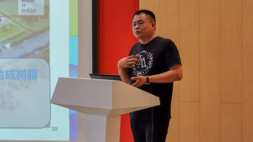 公司黃總在項目現(xiàn)場,就該項目的保溫復合裝飾一體板工程特點和實際施工中的技術優(yōu)化與各位領導及專家成員進行了分享和溝通。