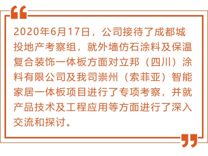 2020年6月17日,公司接待了成都城投地產(chǎn)考察組,就外墻仿石涂料及保溫復合裝飾一體板方面對立邦(四川)涂料有限公司及我司崇州(索菲亞)智能家居一體板項目進行了專項考察,并就產(chǎn)品技術及工程應用等方面進行了深入交流和探討。